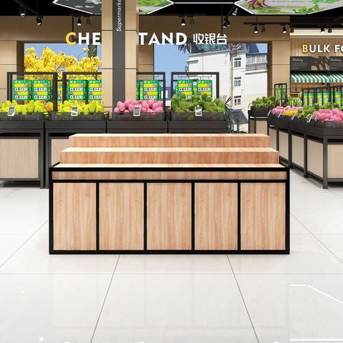 Estante de exhibición de madera de metal moderno Nuevo personalizado estante de supermercado resistente de un solo lado con gabinete